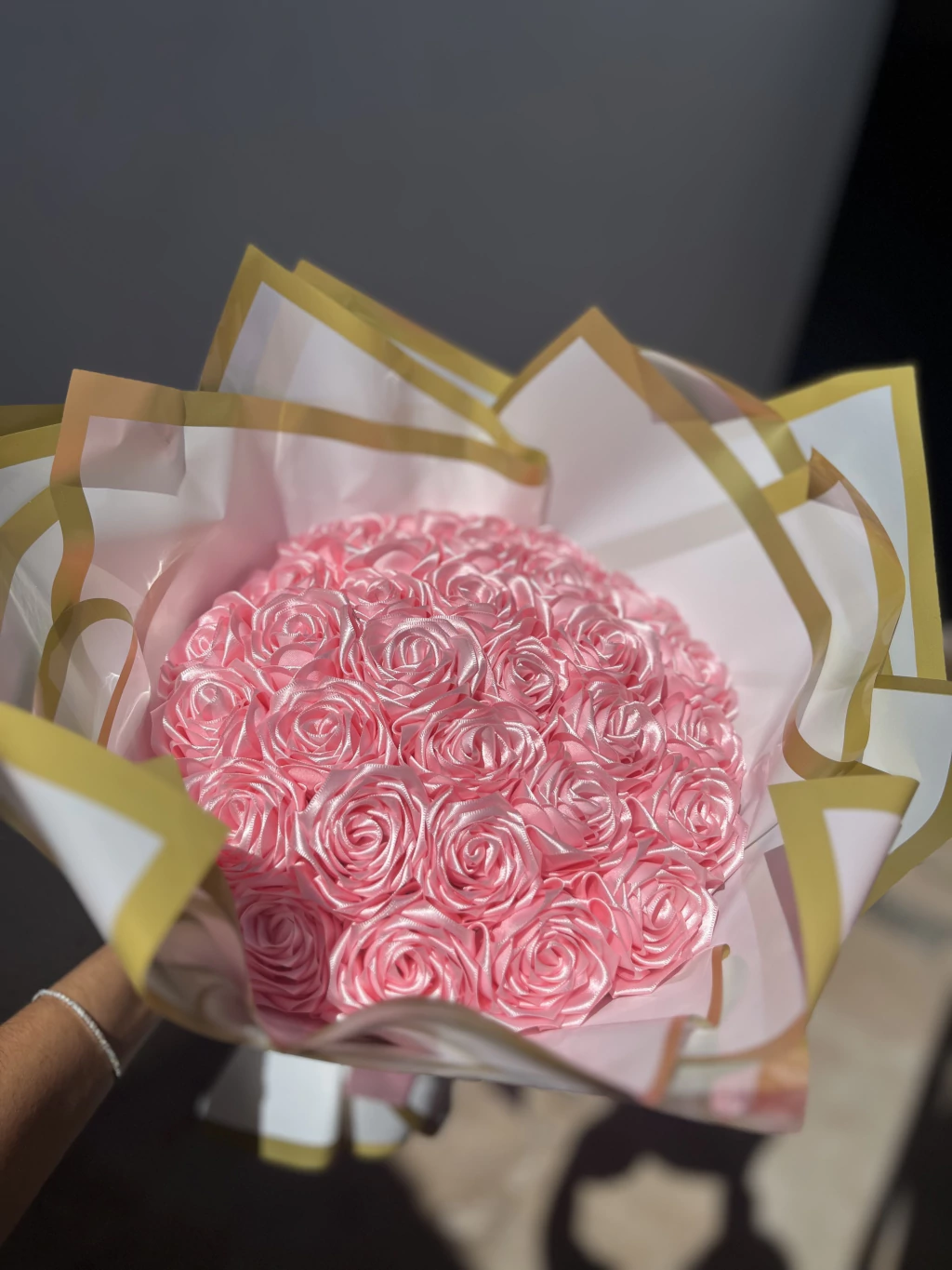 contém 30 rosas, na cor rosa bebê e embalagem branca com bordas douradas